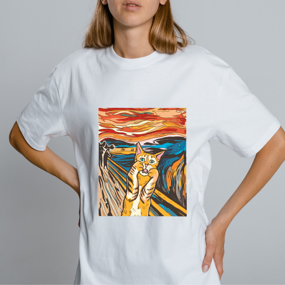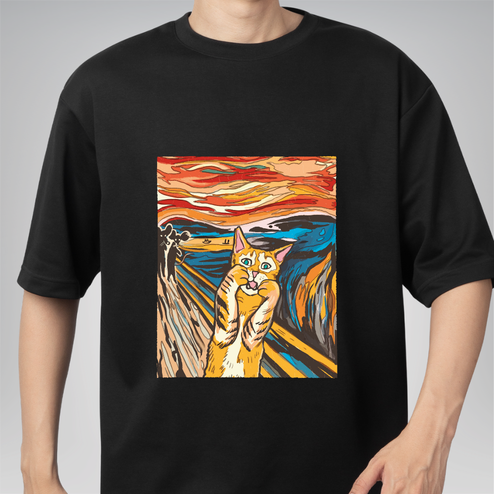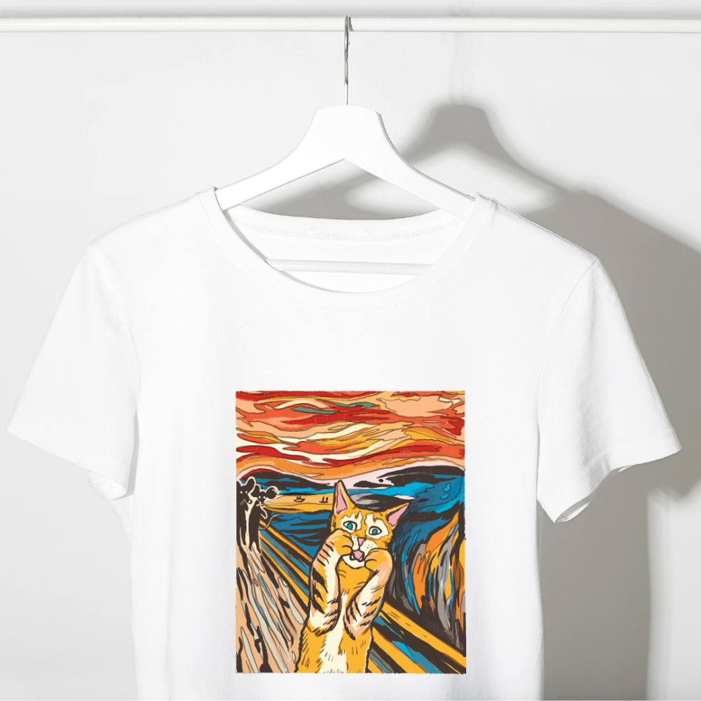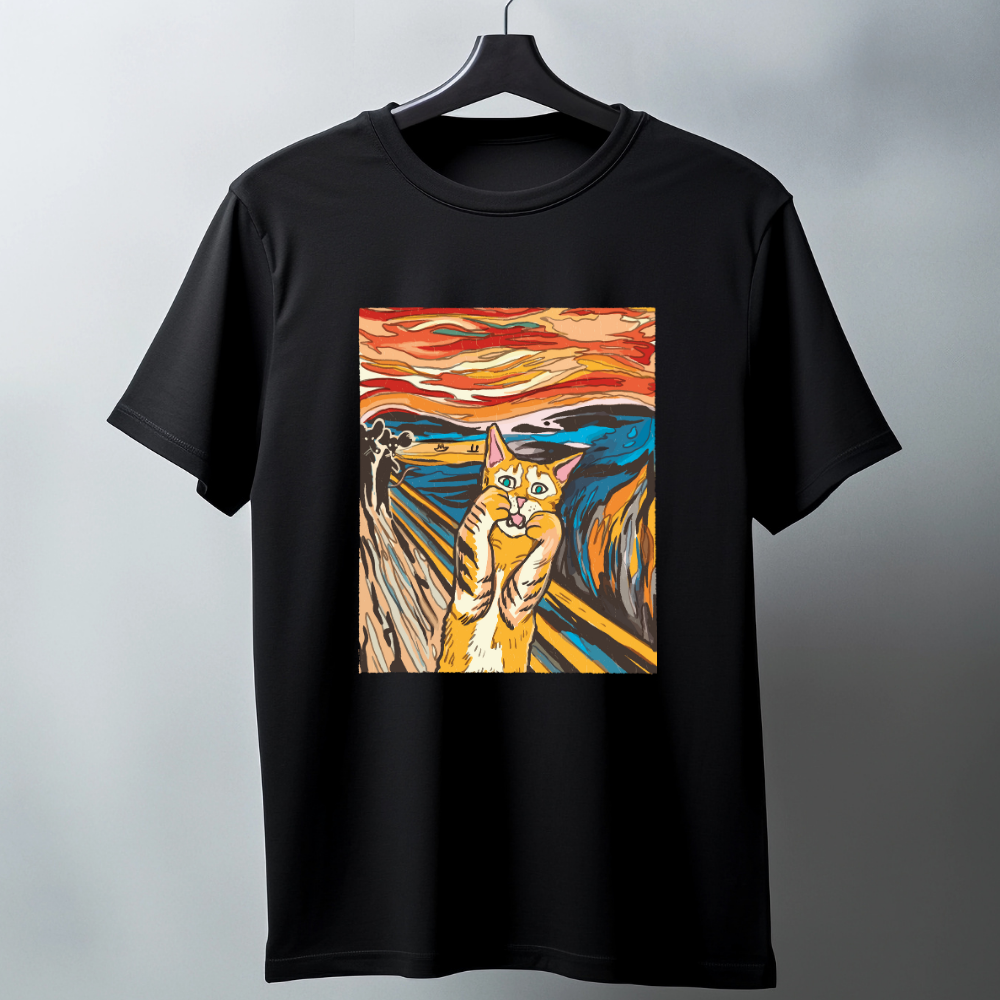 Descubre la Camiseta The Cat Scream, una prenda que combina comodidad y diseño con un aire artístico inspirado en la obra maestra El Grito de Edvard Munch, reinterpretada con un toque felino divertido y único.